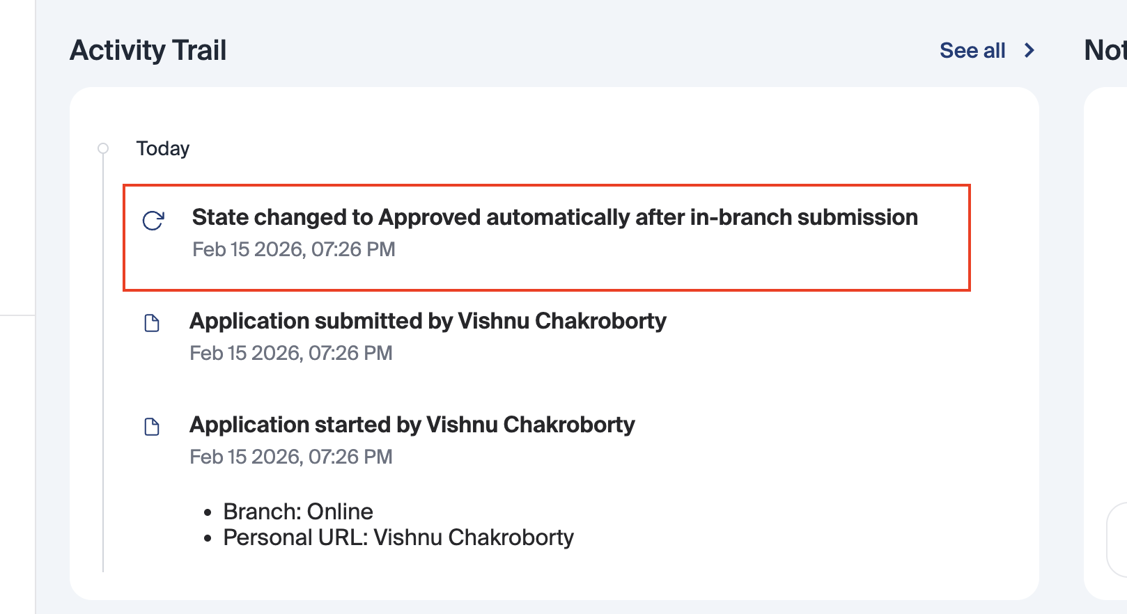 Activity Trail – Dashboard Auto-Approved State Changes: Auto-approved state changes are now captured and visible in the activity trail on the dashboard, improving audit visibility and transparency for automatically processed applications.