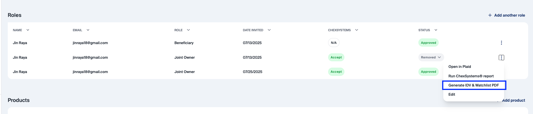 Enhanced PDF Generation for IDV & Watchlist: Staff can now quickly generate IDV and Watchlist PDFs directly from the roles table. Simply click the three-dot menu and select “Generate IDV & Watchlist PDF” for a streamlined, efficient process.